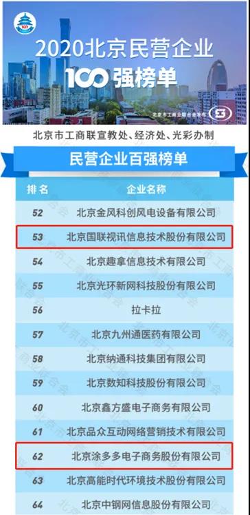 其中北京國聯視訊信息技術股份有限公司、北(běi)京塗多(duō)多(duō)電(diàn)子(zǐ)商務股份有(yǒu)限公司入選2020北(běi)京民(mín)營企業(yè)百強榜。