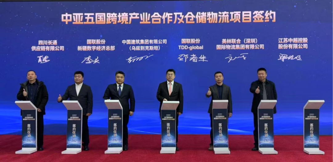 國(guó)聯股份TDD-global總經理(lǐ)邵春生(shēng)與中國(guó)建築烏茲别克斯坦公司總經理(lǐ)蔡雲輝,美(měi)林(lín)聯合(深圳)國(guó)際物(wù)流集團有(yǒu)限公司總經理(lǐ)劉軍,江蘇中超控股股份有(yǒu)限公司總經理(lǐ)梁曉明(míng);國(guó)聯股份新疆總經理(lǐ)李慶與四川長(cháng)通(tōng)供應鏈有(yǒu)限公司總經理(lǐ)肖濤簽署中亞五國(guó)跨境産業(yè)合作(zuò)及倉儲物(wù)流項目。