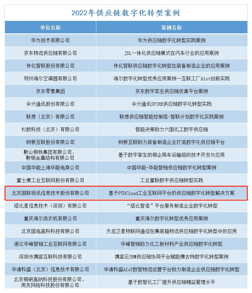 近(jìn)日(rì),工(gōng)業(yè)互聯網産業(yè)聯盟公布了(le)“2022年(nián)供應鏈數(shù)字化(hu∞à)轉型案例”名單,華為(wèi)、京東(dōng)等單位名列其中。國(guó)聯股份憑借“基于PTDCloud工(gōng)業(yè)互聯網平台的£(de)供應鏈數(shù)字化(huà)轉型解決方案”案例成功入選。