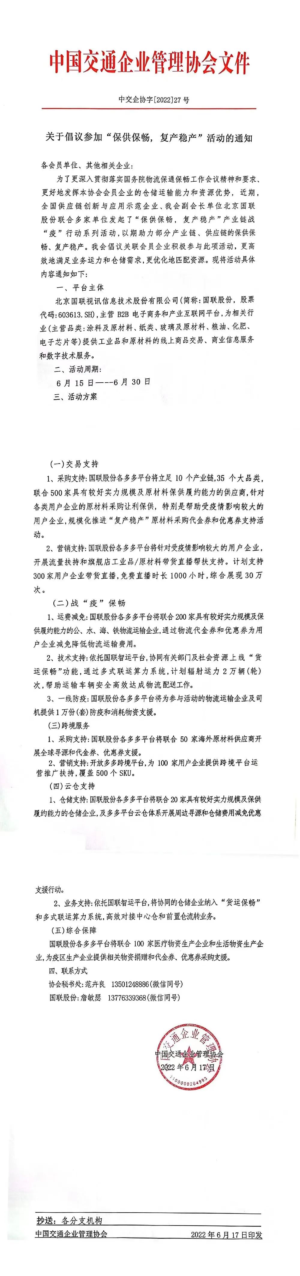 6月(yuè)17日(rì),中國(guó)交通(tōng)企業(yè)管理(lǐ)協會(huì)發布中交企協字[2002]27号通(tōngσ)知(zhī)文(wén)件(jiàn),倡議(yì)會(huì)員(yuán)單位及相(xiàng)關企業(yè),參與國(guó)聯股份“保供保暢、穩産複産”産業(yè)鏈戰役支援行(xíng)動。