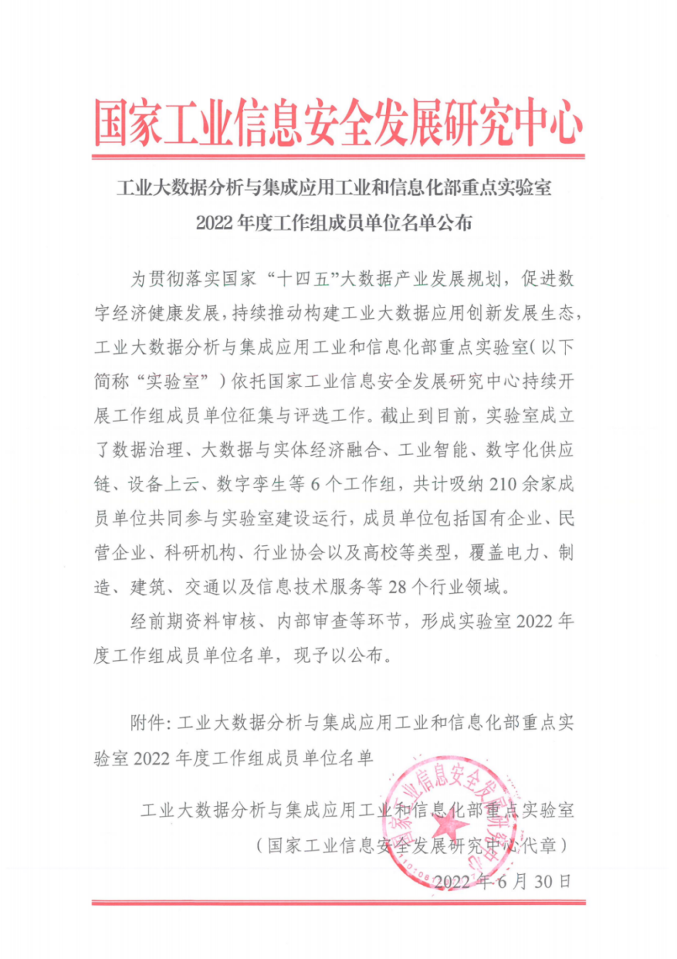 國(guó)聯股份入選工(gōng)業(yè)大(dà)數(shù)據分(fēn)析與集成應用(yòng)工(gōng)業(yè)和(≈hé)信息化(huà)部重點實驗室2022年(nián)度工(gōng)作(zuò)組成員(yuán)單位名單