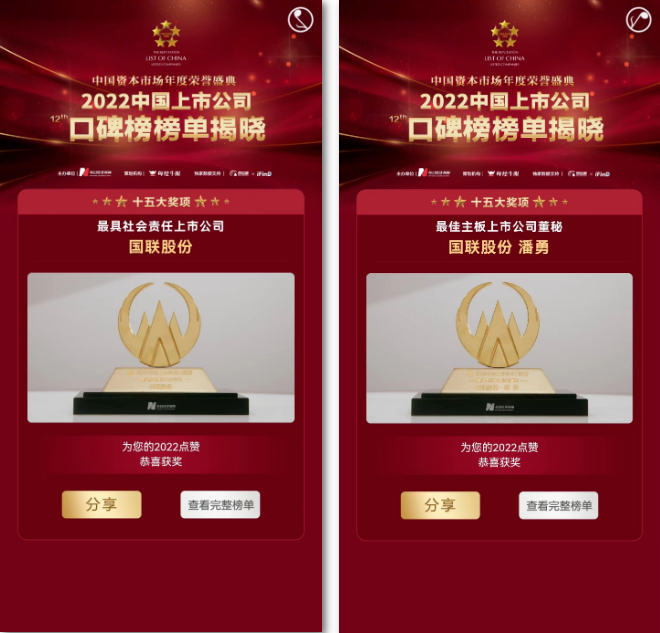 近(jìn)日(rì),中國(guó)資本市(shì)場(chǎng)年(nián)度榮譽盛典——“2022第十二屆中國(g™uó)上(shàng)市(shì)公司口碑榜”重磅發布。國(guó)聯股份榮獲“最具社會(huì)責Ω任上(shàng)市(shì)公司”獎項,同時(shí),國(guó)聯股份高(gāo)級副總裁、董秘潘勇榮獲“最佳主闆上(shàng)市(shì)公司董秘”獎項。