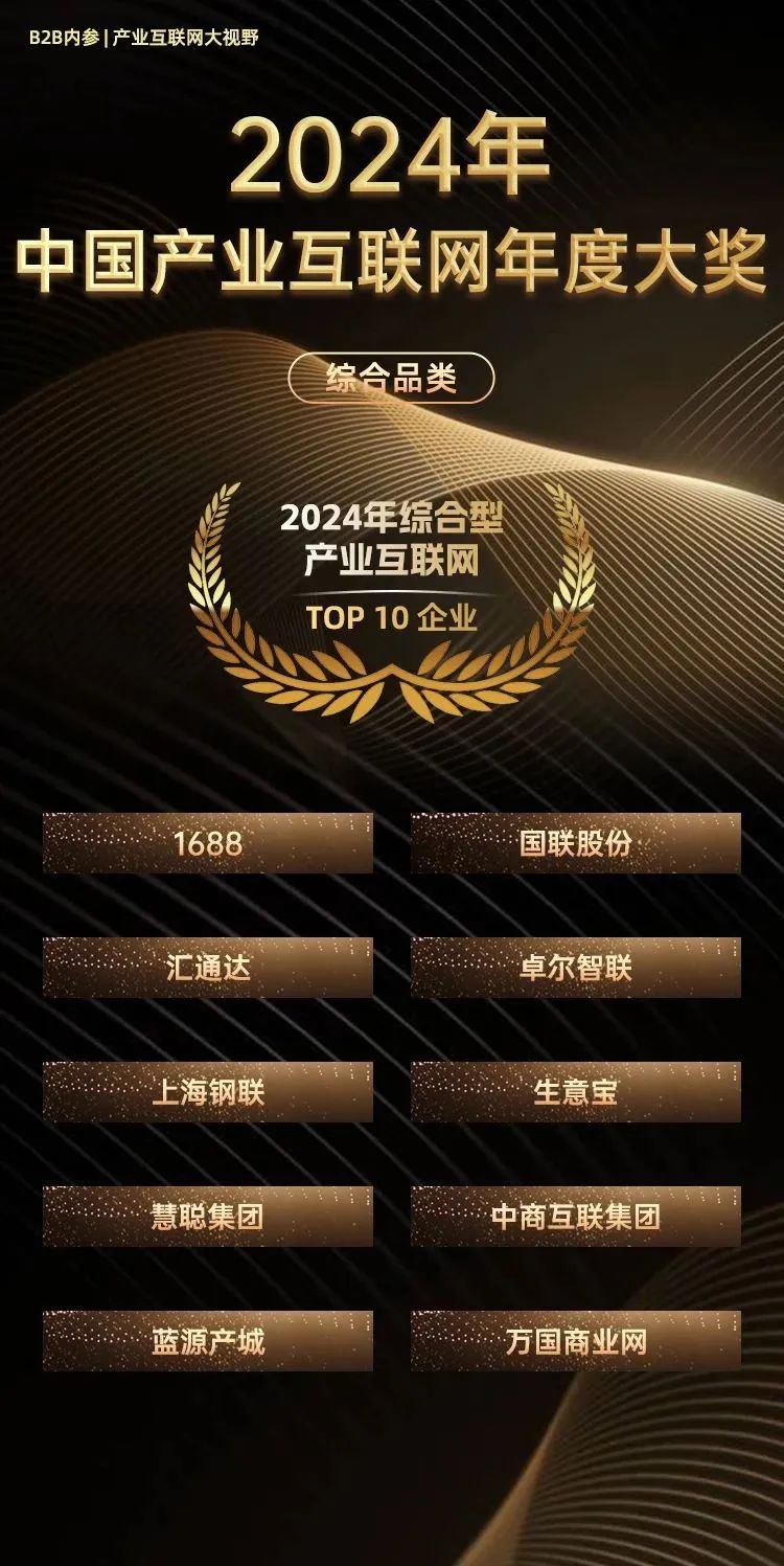 • 綜合品類:國(guó)聯股份入選 2024 年(nián)綜合性産業(yè)互聯網 TOP10 企業(yè)。