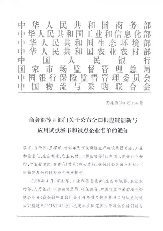 2018年(nián)10月(yuè)16日(rì),商務部、工(gōng)業(yè)和(hé)信息化(huà)部、‌生(shēng)态環境部、農(nóng)業(yè)農(nóng)村(cūn)部、人(rén)民(mín)銀(yín)行(xíng)、國(g₹uó)家(jiā)市(shì)場(chǎng)監督管理(lǐ)總局、中國(guó)銀(yín)行(xíng)保♠險監督管理(lǐ)委員(yuán)會(huì)和(hé)中國(guó)物(wù)流與采購(gòu)聯合會(huì)等8部門(mén)聯合公布了(le)全國(guó)供應鏈創新與應¶用(yòng)試點企業(yè)名單(商建函【2018】654号)。國(guó)聯股份與阿裡(lǐ)巴巴、京東(dōng)、TCL等269家(jiā)企業(yè)成功入選全國(guó)供應鏈創♠新與應用(yòng)試點企業(yè)。